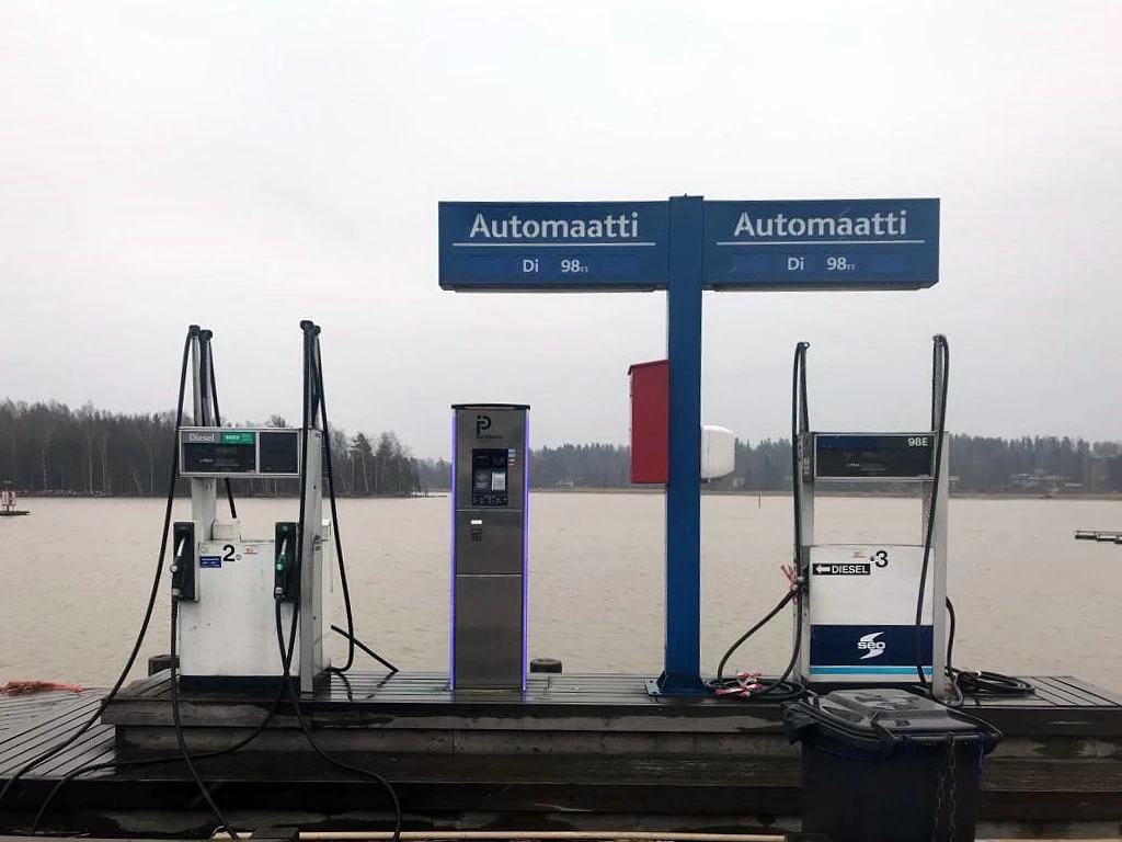 Veneasema Sulkavaan asennetussa uudentyyppisessä polttoaineenmaksuautomaatissa on mahdollisuus maksaa myös viivakoodeilla.
